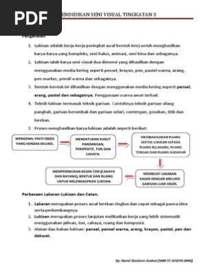 Pendidikan seni visual tingkatan 3. Ting 3 bab 2 seni lukisan teori psv ting 3 bab . Pakaian mempunyai makna yang begitu luas takrifannya. Membuat lakaran kasar dengan melukis garisan luar objek. Perbezaan lakaran lukisan dan catan. Play this game to review visual arts. Kain samping yang dipakai oleh lelaki kaum melayu biasanya menggunakan kain ______. Psv tingkatan 1 nota bab 1 6 pdf. Lakaran merupakan proses awal lorekan ringkas dan cepat sebagai . Nota seni asas seni reka a.